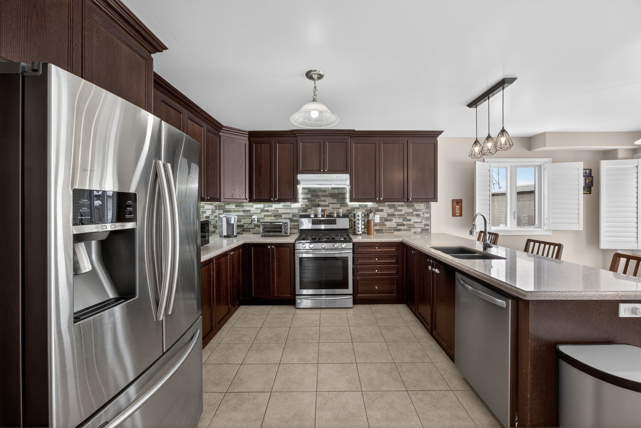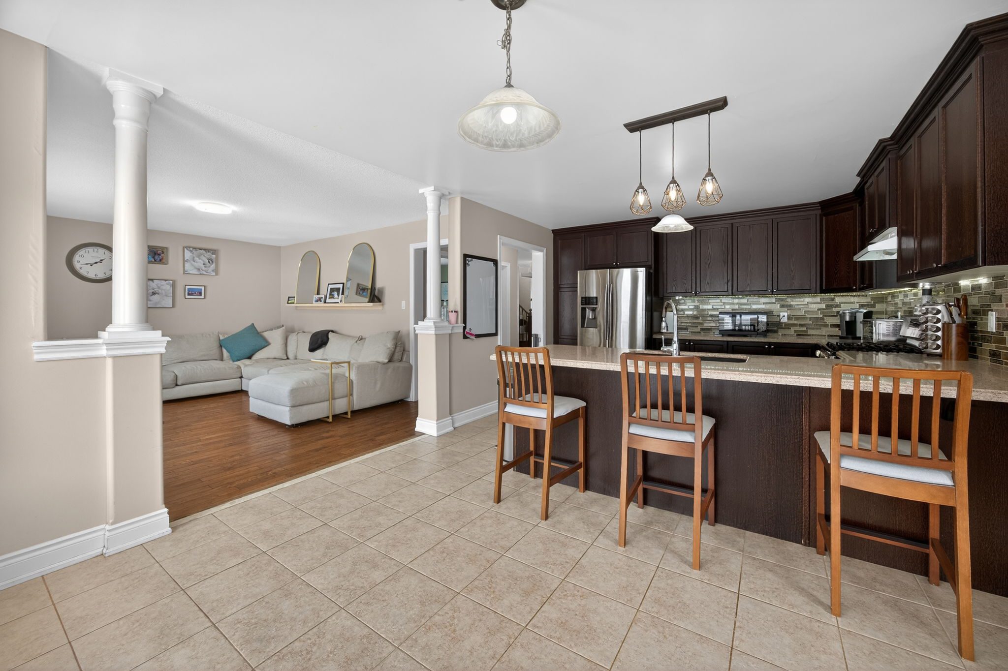 From the moment you arrive, the home’s curb appeal and thoughtful layout stand out. The main level features a bright, open-concept design with a generous living room, formal dining area, and a well-appointed kitchen complete with rich cabinetry, stainless steel appliances, and a large breakfast bar for casual meals. Large windows allow for plenty of natural light, creating an inviting and functional main floor space for both daily living and entertaining. A convenient main-floor laundry room adds everyday practicality.